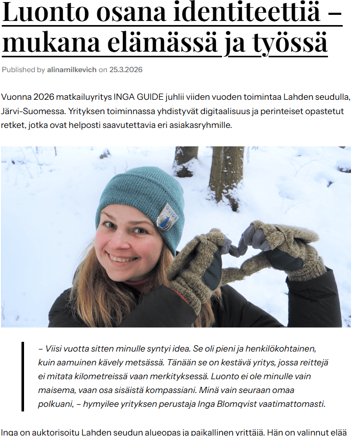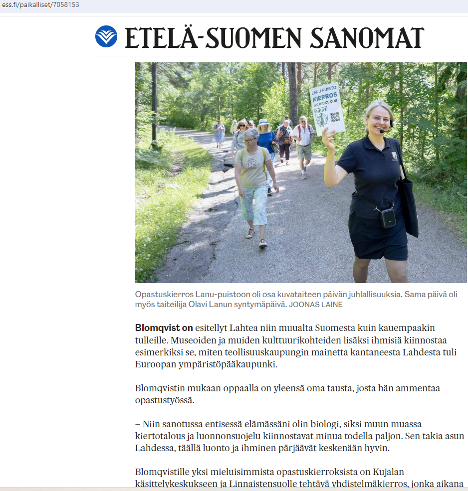 Peisalo, Katja 2025: Suora asiakaspalaute lämmittää oppaan mieltä. Seutu 4 2025 9. elokuuta. 14.8.2025. (nettiversio). https://www.seutuneloset.fi/paikalliset/8757786 Viitattu 14.8.2025.