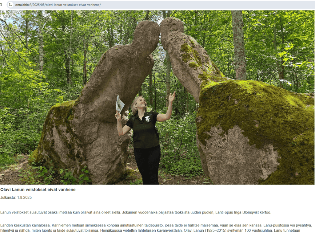 Görman, Petri 2025: Olavi Lanun veistokset eivät vanhene. Omalähiö N:o 26 – 2025 47.vsk 1. elokuuta s. 8. 1.8.2025. (nettiversio). https://www.omalahio.fi/2025/08/olavi-lanun-veistokset-eivat-vanhene/ https://www.e-julkaisu.fi/omalahio/26-2025/#pid=8 Viitattu 6.8.2025.